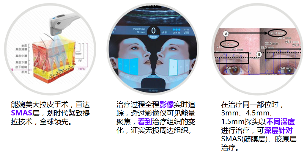 點,以產生65℃-72℃高能量,作用肌膚3.0mm-4.5mm的SMAS層,刺激膠原蛋白的