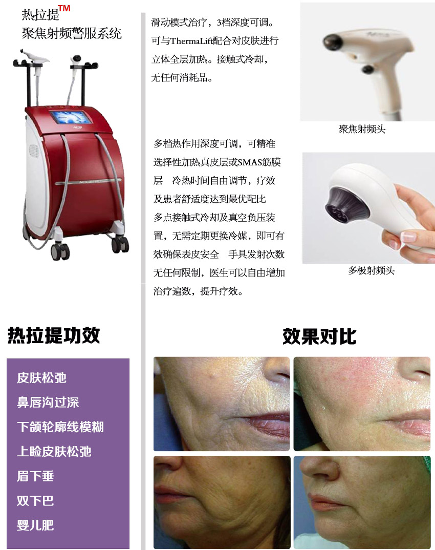 熱拉提:采用聚焦射頻。一般的射頻只能達到皮膚表層、真皮層,但達不到真皮層以下的筋膜層,而熱拉提的深度可以達到筋膜層。所以熱拉提可以起到提拉臉部的作用。另外聚焦射頻比一般的射頻能量更集中,所以能量比一般射頻更大,效果更好。