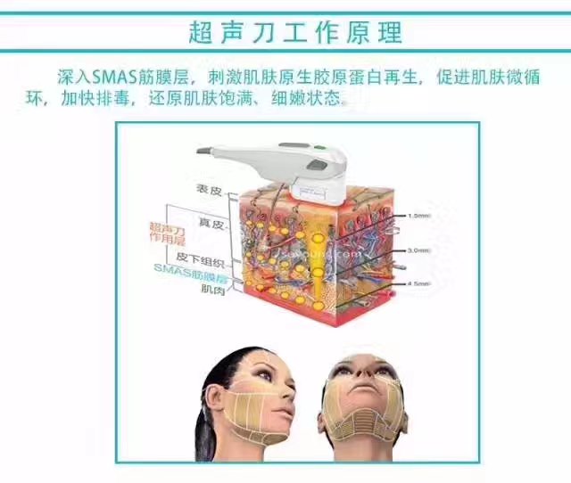 面部結(jié)構(gòu)從淺至深分為:表皮、真皮、皮下脂肪、淺筋膜即SMAS、肌肉及骨骼,傳統(tǒng)外科拉皮手術(shù)針對SMAS系統(tǒng)進(jìn)行懸吊,使肌膚提升收緊,靠手術(shù)才能到達(dá)的治療深度。